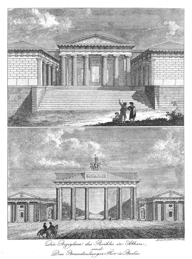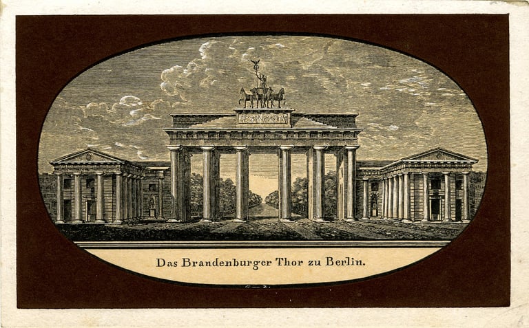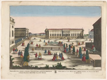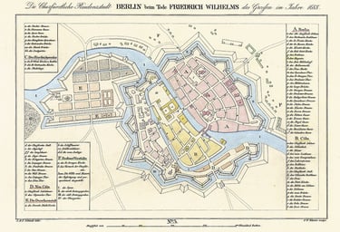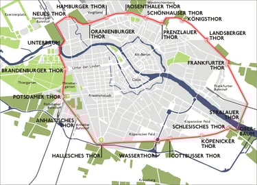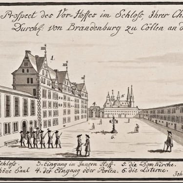 This first map shows the borders of Berlin as 1688. The yellow part is Köln, which is Museum Island today. The second map shows Berlin's borders as of 1790. Notice The Brandenburg Gate (or Thor) leading to Tiergarten. Many of the other 18 gates can be easily found today, marked with U and S-Bahn stations. (Catch some fantastic GDR/Soviet architecture at the Frankfurter Thor.) Next: Unter den Linden, the royal boulevard, running from the palace to the Tiergarten, as it looked in 1691.